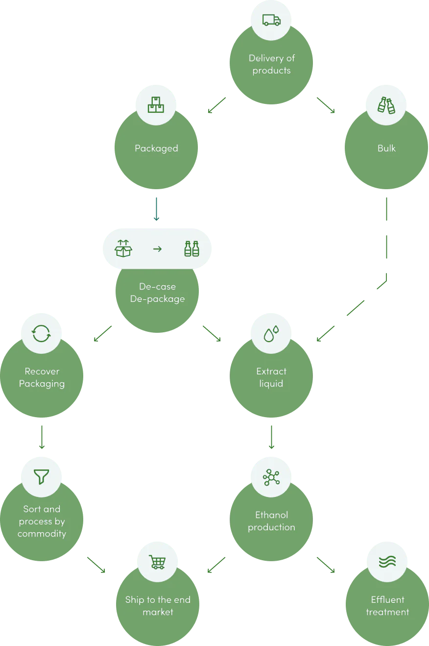All incoming products are "de-cased" and unpackaged to allow for the extraction of liquids. While the liquid is converted into ethanol, all other recovered materials are sorted by commodity type to be recycled. All production effluent is processed through a wastewater treatment system.